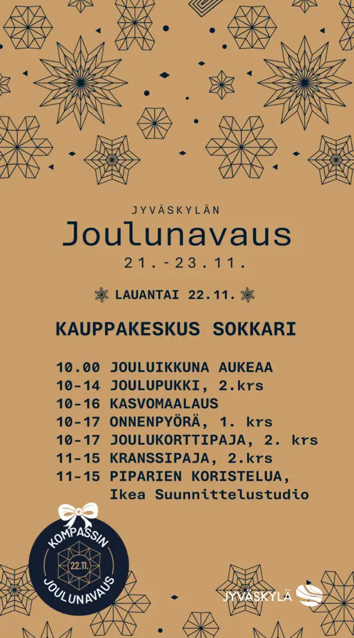 Jyväskylän joulunavaus tulee isompana kuin koskaan - ja me olemme iso osa sitä! Joulunavausta vietetään 21.-23.11. useassa eri paikassa keskustan alueella. Meillä Kauppakeskus Sokkarilla on luvassa iloista joulutunnelmaa ja ohjelmaa sekä elämyksiä koko perheelle lauantaina 22.11. Päivän aloittaa jo perinteeksi muodostunut jouluikkunan avaus. Katso koko ohjelma alta!